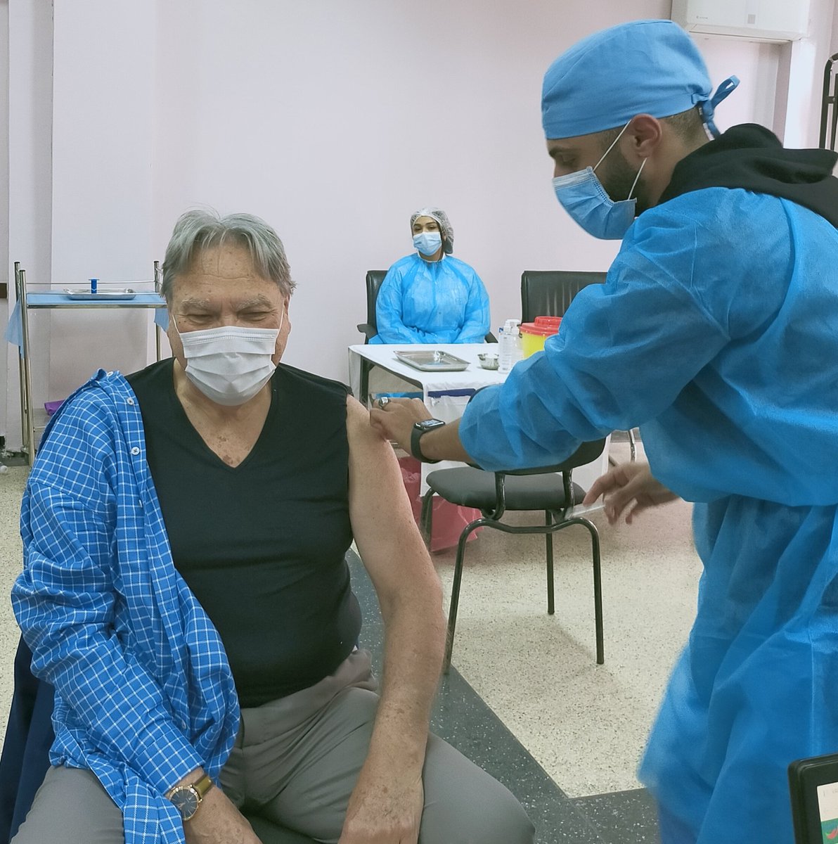 Lino Bacco reçoit sa 2e dose d’AstraZeneca à Casablanca et félicite le personnel médical pour leur travail.