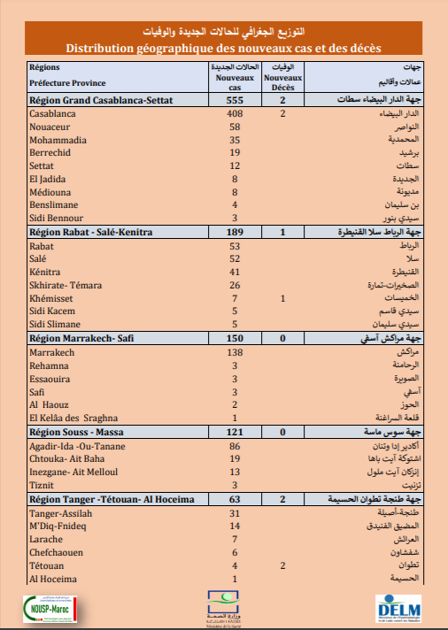 Le nouveau bilan porte à 539 839 le nombre de contaminations dans le Royaume depuis le premier cas signalé le 2 mars dernier et à 523 128 le nombre des personnes totalement rétablies, soit, un taux de guérison de 97,5% a indiqué le ministère de la Santé dans son bulletin quotidien Covid-19. Le nombre des morts est passé à 9 351avec l'enregistrement de 5 nouveaux décès ces dernières 24h.