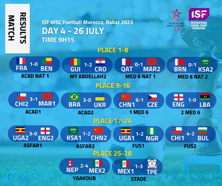 Mercredi 26 juillet ,22 matchs se sont déroulés dans le cadre du Mondial du football scolaire Rabat 2023.