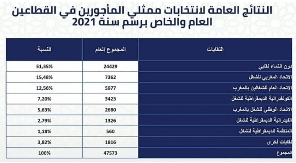 Pour ce qui est des élections dans le secteur privé qui comporte le plus grand nombre de représentants, les non affiliés ont gagné 22.213 sièges, soit un taux de 57,30%, suivis de l'UGTM ont décroché quelque 5.035, soit12,99%, l'UMT avec un taux de 12,82%, obtient 4.969 délégués, l'UNMT 2.339, soit 6,03%, la CDT 2.113, soit 5,45%, la FDT 440, soit 1,14 %, l'ODT 409, soit 1,06% et d'autres syndicats ont obtenus 1.245 sièges, soit un taux de 3,21%.