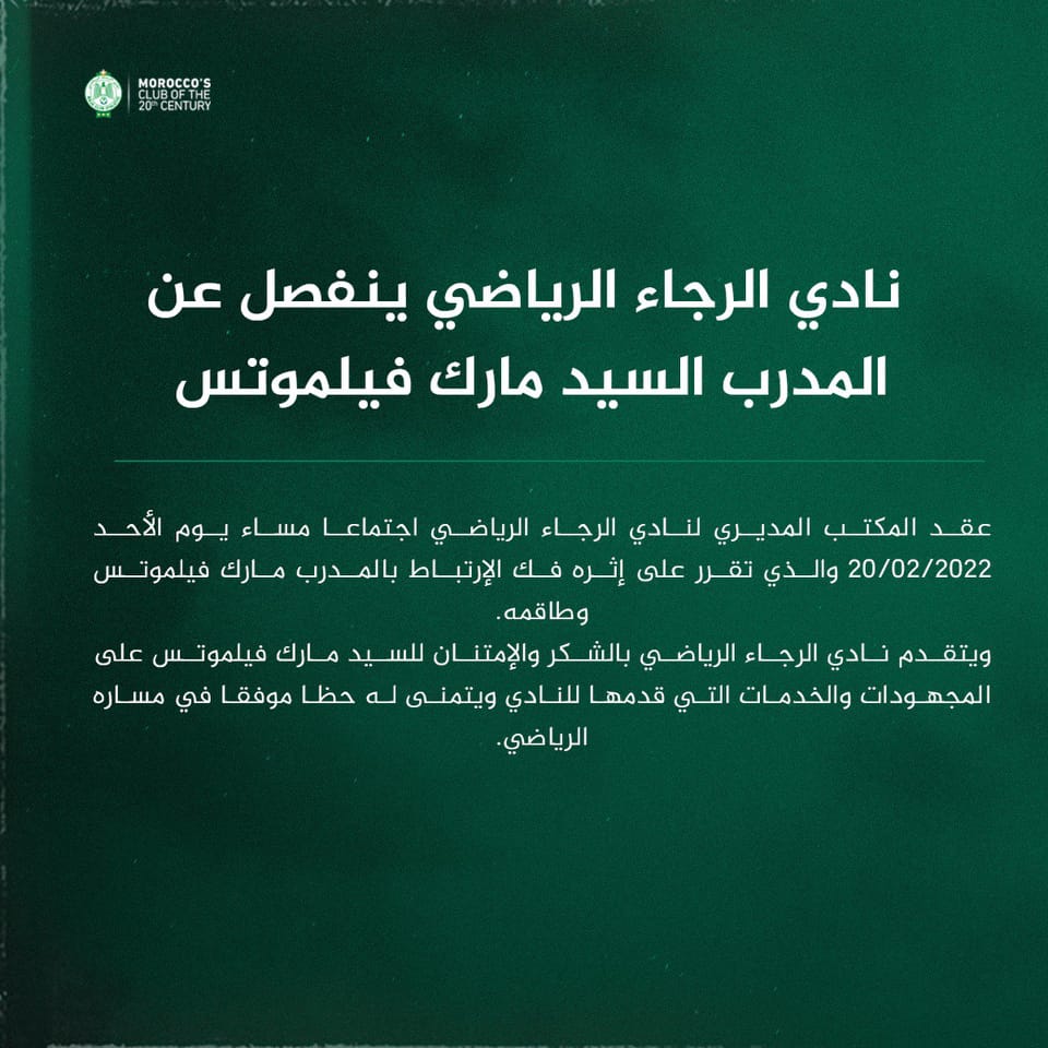 La décision était pressentie. Wilmots n’était jamais parvenu à faire tourner convenablement l’effectif dont il disposait. Le président du club était assailli de tous bords. Les critiques pleuvaient de toutes parts. Le Raja était vraiment en difficultés et souvent sauvé par des exploits individuels.
