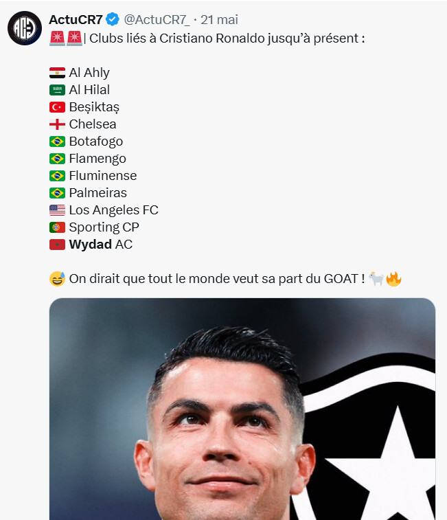 Il s’agit de la prétendue participation de l’international portugais, Ronaldo à la CDM des Clubs sous le maillot du Wydad.